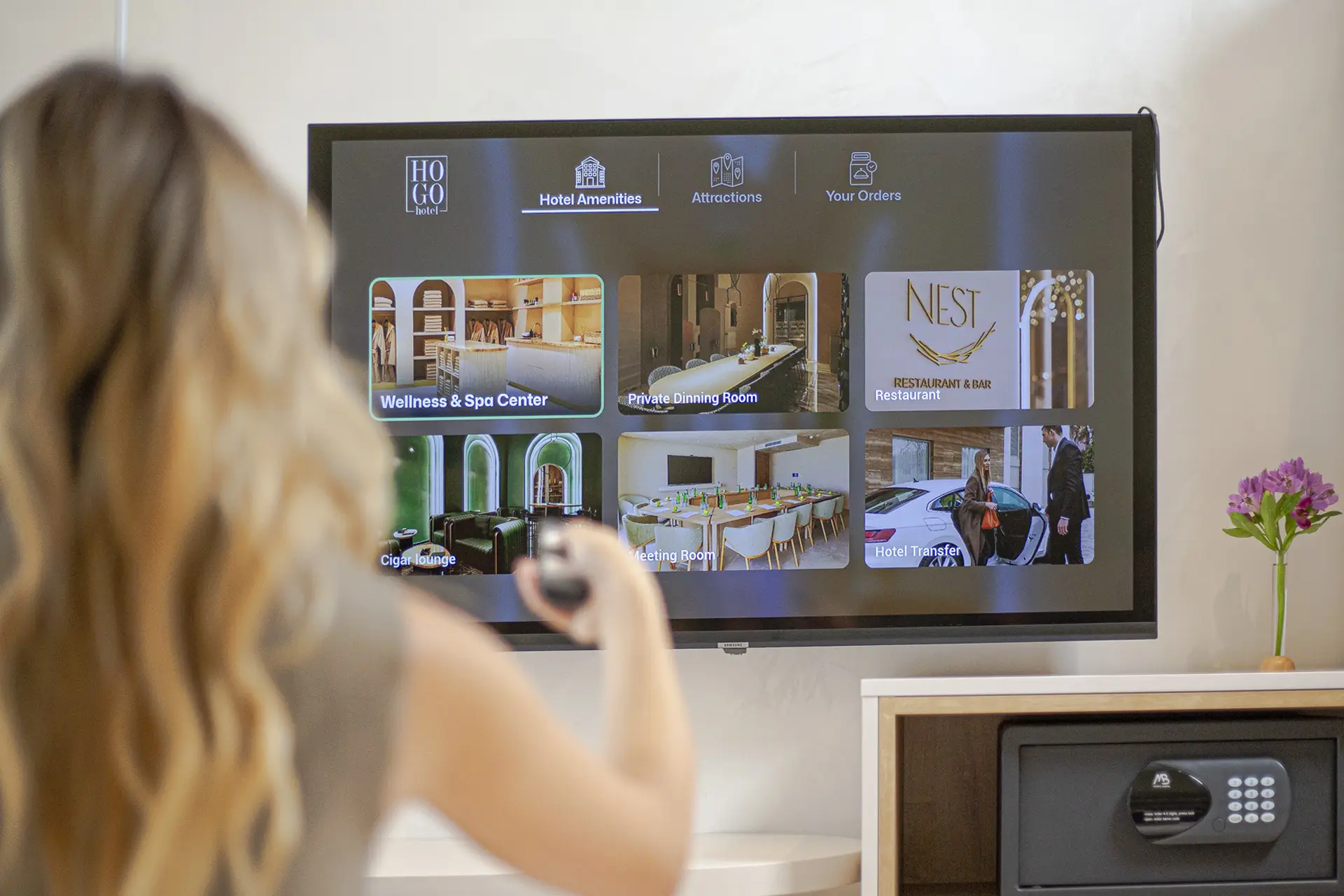 Jednim dodirom na ekranu, bez poziva i čekanja, otvara se meni restorana NEST i mogućnost da odaberete jelo ili piće po svom ukusu. Sve je kreirano tako da uživate u maksimalnom komforu i privatnosti, bez narušavanja mira i atmosfere vašeg boravka.